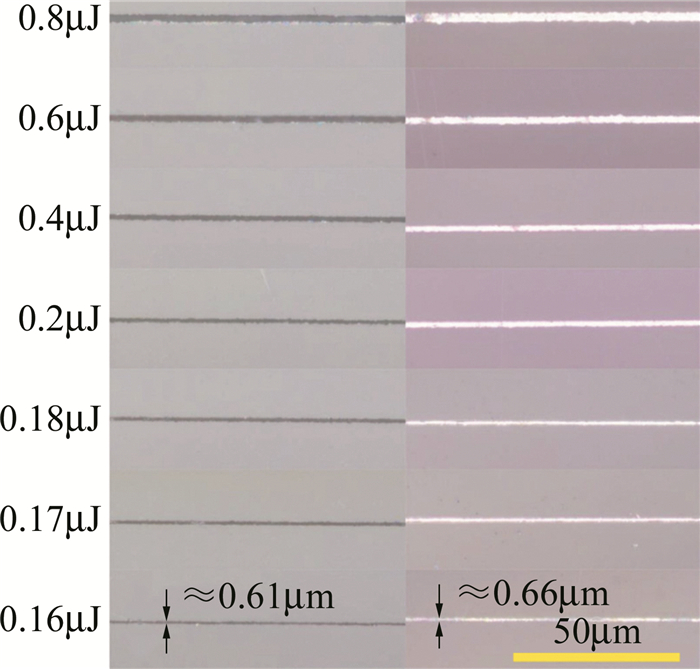 激光直寫刻蝕玻璃方法,按激光波長不同主要分為紅外和紫外激光刻蝕法,而按照激光脈寬不同則可分為:連續激光刻蝕;納秒、皮秒及飛秒激光刻蝕。YANG等人使用248nm深紫外準分子激光在石英玻璃表面刻蝕微通道,試驗中發現激光能量密度是決定石英玻璃發生刻蝕及裂損的主要因素,無裂損刻蝕石英玻璃的激光能量密度閾值區間應在16J/cm2~30J/cm2;而掃描次數的增加、重復頻率和微通道深度的增大也會加劇微通道的裂損程度,最后通過加工參量的優化(激光能量密度23.5J/cm2,圓弧段重頻為50Hz,直線段重頻為40Hz,掃描1)實現了寬度小于100μm的直線型(深度不大于50μm)和圓弧型微通道(深度不大于28.5μm)的無裂損刻蝕。LI等人利用波長為355nm, 脈寬為10ns~25ns的全固態紫外激光器直寫刻蝕BF33硼硅玻璃微通道,試驗中采用單一變量法探究激光能量密度、重復頻率、掃描速率等參量對刻蝕效果的影響,試驗結果表明,當激光能量密度過大時,玻璃易發生嚴重崩邊裂損現象,刻蝕深度減??;而隨著重復頻率的減小,通道碎裂現象減輕,刻蝕深度增大。YU等人采用波長為1030nm、脈寬和重復頻率分別為290fs, 50kHz的飛秒激光器在石英玻璃樣品上刻蝕線寬小于1μm的凹槽圖案以制備亞微米金屬線,研究了不同脈沖能量激光與燒蝕凹槽及機械拋光后的金屬線的線寬之間的關系,如圖 1所示。結果表明,當脈沖能量在0.18μJ以下時,凹槽線寬已降低至1μm以下,最終在石英玻璃上制備出多種不同圖案且線寬穩定控制在0.8μm左右的凹槽。