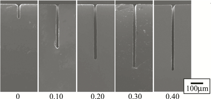 對于激光誘導背部濕法刻蝕,溶劑材料種類和激光工藝參量的選取都對刻蝕質量有較大的影響。EHRHARDT等人以甲苯溶液為液體介質,采用355nm266nm的皮秒激光對石英玻璃進行刻蝕,發現甲苯溶液中芘的含量對去蝕率有較大影響,且在一定范圍內芘的含量越高,去蝕率越大。KWON等人提出在使用波長為1064nm、脈寬為100ns的近紅外激光刻蝕鈉鈣玻璃的過程中,可通過在吸收劑中加入磷酸抑制裂紋的產生,通過對比不同磷酸質量分數(0~0.40)的吸收劑刻蝕效果(如圖 5所示)發現,加入磷酸后,可刻蝕深度提高了約5(103μm提高到530μm),且側壁的粗糙度從0.55μm下降到0.16μm;此外,通過調整溶液中的磷酸濃度,可以制備出多種不同形狀及深寬比的微通道。SUN等人利用飛秒激光分別在空氣、水和乙醇中加工熔石英玻璃,結果表明,以乙醇為吸收介質時,熔石英玻璃的燒蝕閾值從2.22J/cm2降到了1.02J/cm2,進一步研究發現,刻蝕時乙醇比水需更低的激光能量便能達到形成等離子體的電子密度,同時激光誘導等離子體形成后會在液體中產生氣泡,酒精中的氣泡比水中的對石英表面的沖擊壓力更大。
