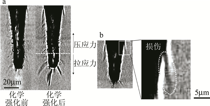 超快激光由于作用時間非常短,加工時的熱滲透很小,在玻璃樣品上不會留下很大的熱影響區域,能夠有效地減少加工后微裂紋的產生。ARGUMENT使用波長為248nm~800nm、脈寬為130fs~300fs的飛秒激光器在石英玻璃上加工出寬度在25μm~40μm,深度可達100μm的微孔,后續研究發現通過在加工前預熱玻璃基板,在玻璃基板上預先制備金屬鎢薄膜,加工后通過過氧化氫腐蝕去除的辦法可以有效地減少裂紋和碎片的產生。CHUANG等人利用波長為1065nm的皮秒激光器在超薄玻璃上加工出一連串直徑為3μm、間隔為2μm~3μm的通孔,在掃描電子顯微鏡(scanning electron microscopeSEM)下觀察玻璃微孔橫截面發現沒有可見的熔化區,這表明皮秒激光加工微孔時的熱影響區基本可以忽略不計。ITO等人對化學強化玻璃進行飛秒激光打孔試驗, 并通過數值分析加工時的應力波的傳播及溫度場的分布,發現制孔側壁和底部的殘余應力主要是由應力波引起的,而孔入口周圍的損傷則與熱應力的弛豫有關,如圖 6所示。WEI等人建立了基于飛秒激光抽運-探測原理的時間分辨陰影成像平臺,直接獲取了飛秒激光燒蝕石英微孔的超快過程圖像,如圖 7所示。通過對不同能量密度、時間延遲、脈沖條件下拍攝圖像的分析,發現在飛秒激光燒蝕制備石英微孔的過程中,當能量密度低于石英玻璃破壞閾值時,石英玻璃表面觀測到沖