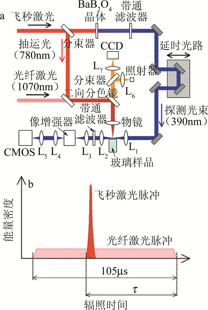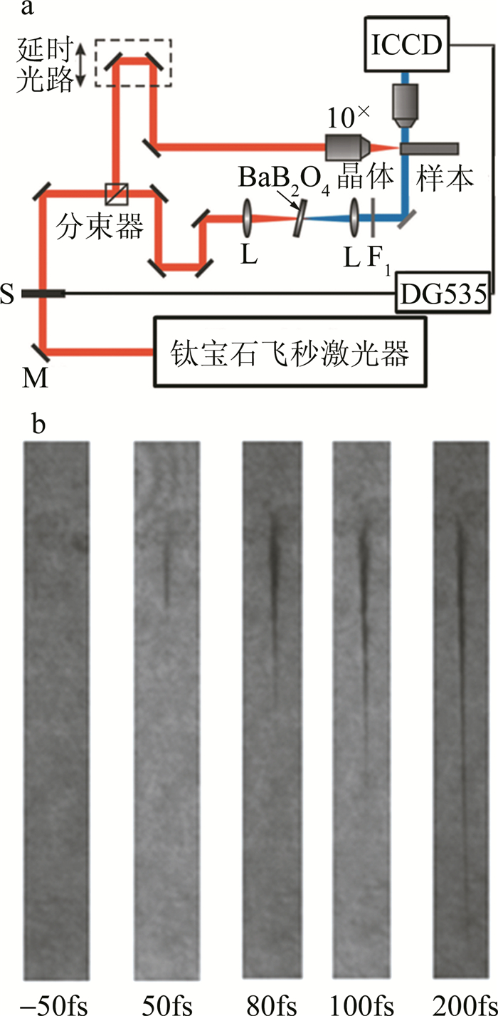 a—時間分辨陰影成像光路圖b—石英介質中零延時附近的飛秒激光誘導的等離子通道
