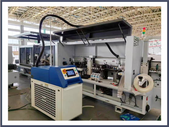 激光封邊: 通過將高能量的激光束聚合到激光封邊帶上, 高能量的激光快速融化封邊帶 的功能層, 然后通過壓輪機構, 將邊帶壓緊在工件上, 再經過截斷、初修、精修、跟蹤倒圓 等工序,從而實現封邊的目的。